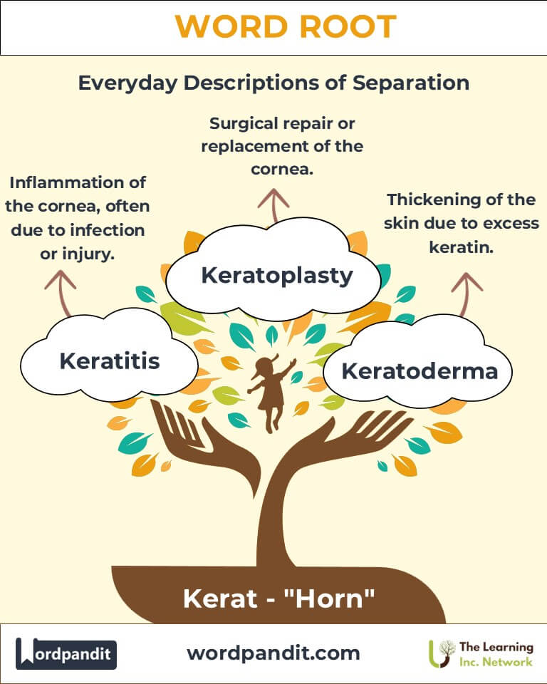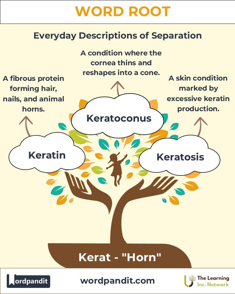 Discover the fascinating role of the word root "kerat," derived from Greek, meaning "horn." From keratin, the protein that fortifies our hair and nails, to keratitis, a condition affecting the cornea, "kerat" has shaped both biological and medical vocabularies with its association to structure, strength, and protection.