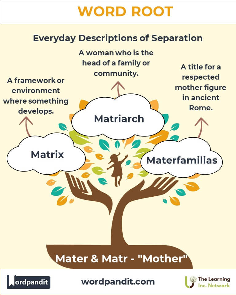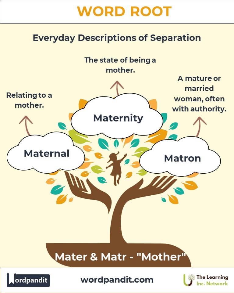 Imagine the universal archetype of motherhood—an enduring source of life, care, and protection. The roots mater (pronounced may-ter) and matr (pronounced mah-tr) encapsulate this nurturing essence. Originating from Latin, meaning “mother,” these roots are found in diverse words that celebrate origins and foundational relationships, from maternal (motherly) to matrix (a framework for growth). Across disciplines, these roots symbolize the vital role of mothers as creators and sustainers.