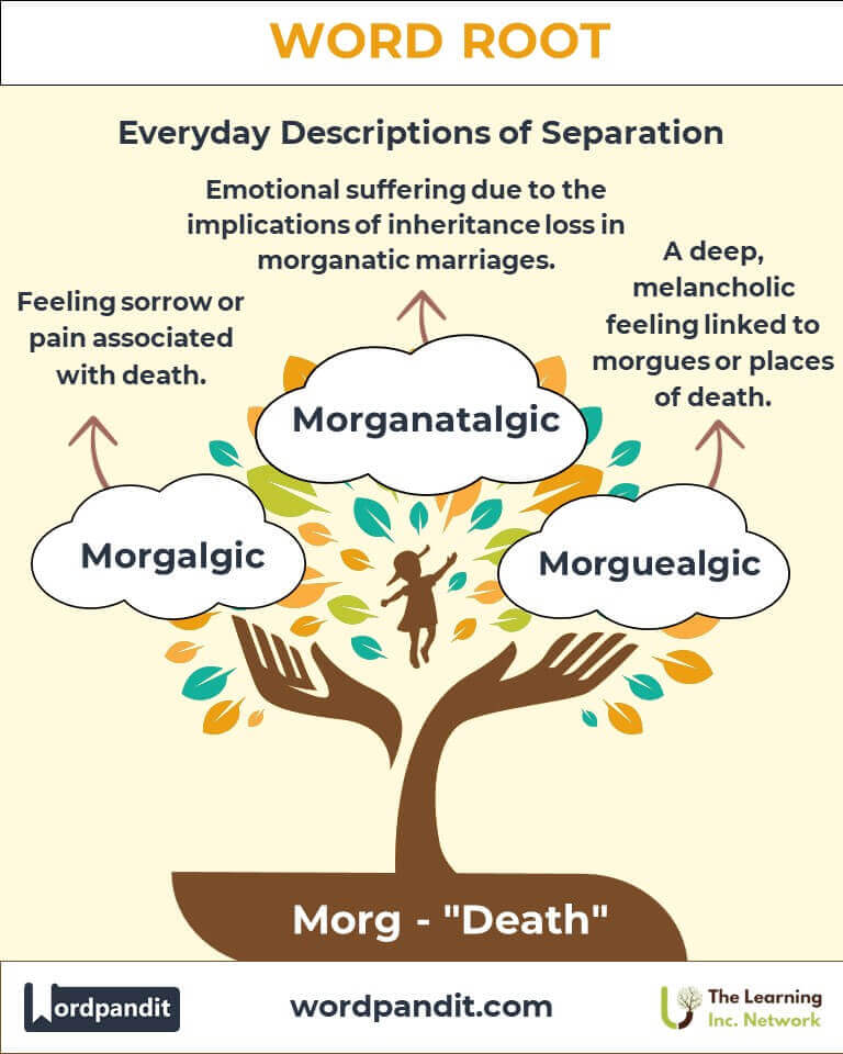 The word root "morg," pronounced as "morg," conveys themes tied to "death" and its ramifications. It forms the basis of somber terms like "morgue," a place of deceased identification, and "morganatic," a term describing a marriage where one party waives claims to inheritance or rank. Despite its grim associations, this root provides an essential lens into societal constructs around mortality.