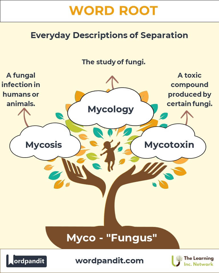 What connects life-saving medicines, nutrient recycling, and plant survival? The answer lies in the root "Myco," derived from the Greek mykes, meaning "fungus." Pronounced my-koh, this root forms the foundation of words that describe the incredible and diverse kingdom of fungi. Whether in mycology (the study of fungi) or mycorrhiza (symbiotic relationships between fungi and plant roots), "myco" highlights fungi's importance in science, ecology, and everyday life.