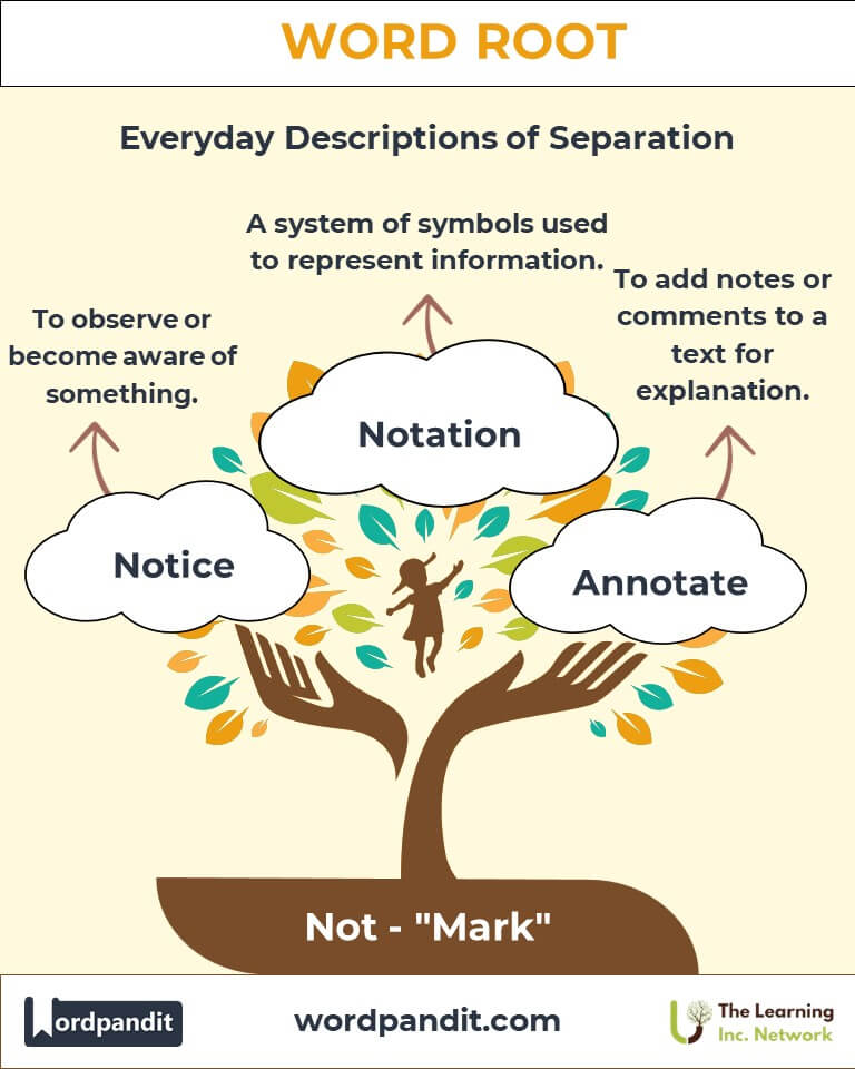 To remember the root "not," picture a brightly colored marker circling important information in a book or creating a symbol on a page. The act of marking connects directly to the root’s essence.