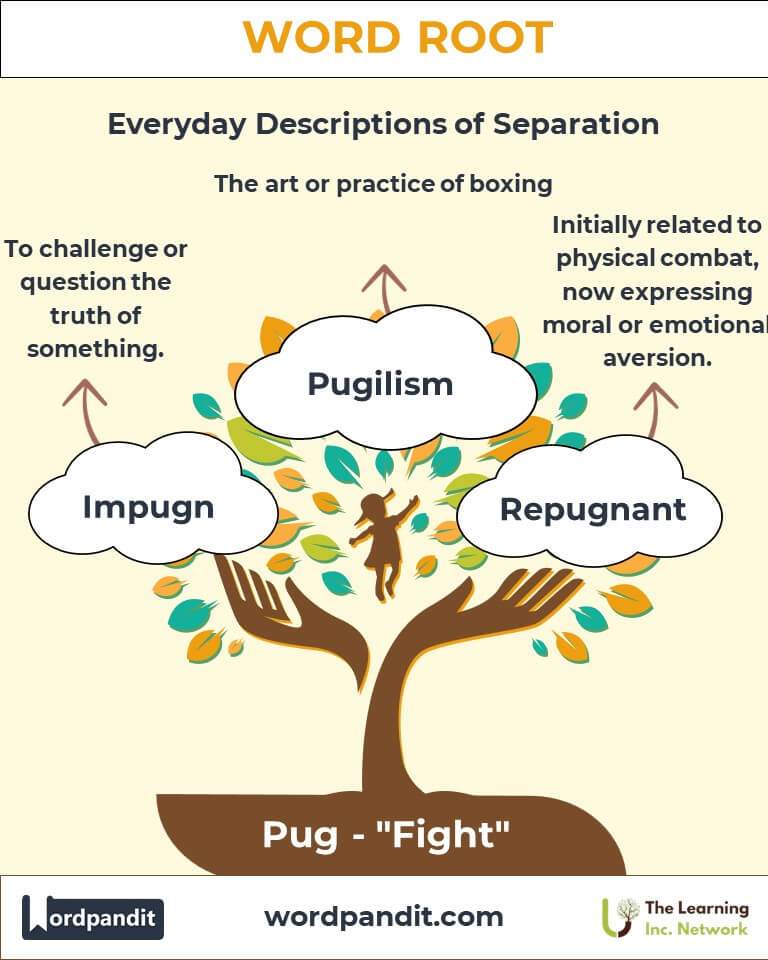 A: The root "Pug" originates from the Latin "pugnare," meaning "to fight." It forms the basis of words describing physical combat (like pugilism), contentious behavior (like pugnacious), and metaphorical struggles (like repugnant or impugn).