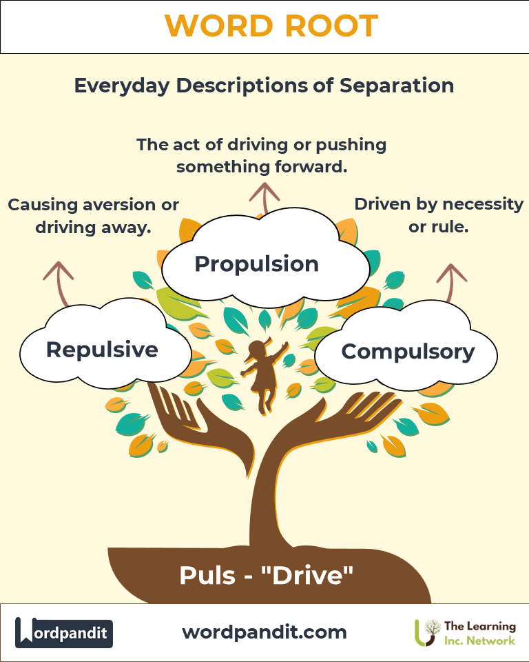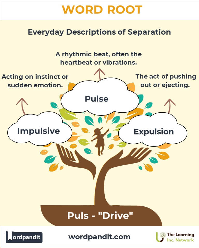 A: "Puls" comes from the Latin root "pulsus," meaning "drive" or "push." It represents motion, energy, or force applied to create movement or change. This concept is reflected in words like "pulse" (a rhythmic push or beat) and "propulsion" (a force driving something forward).