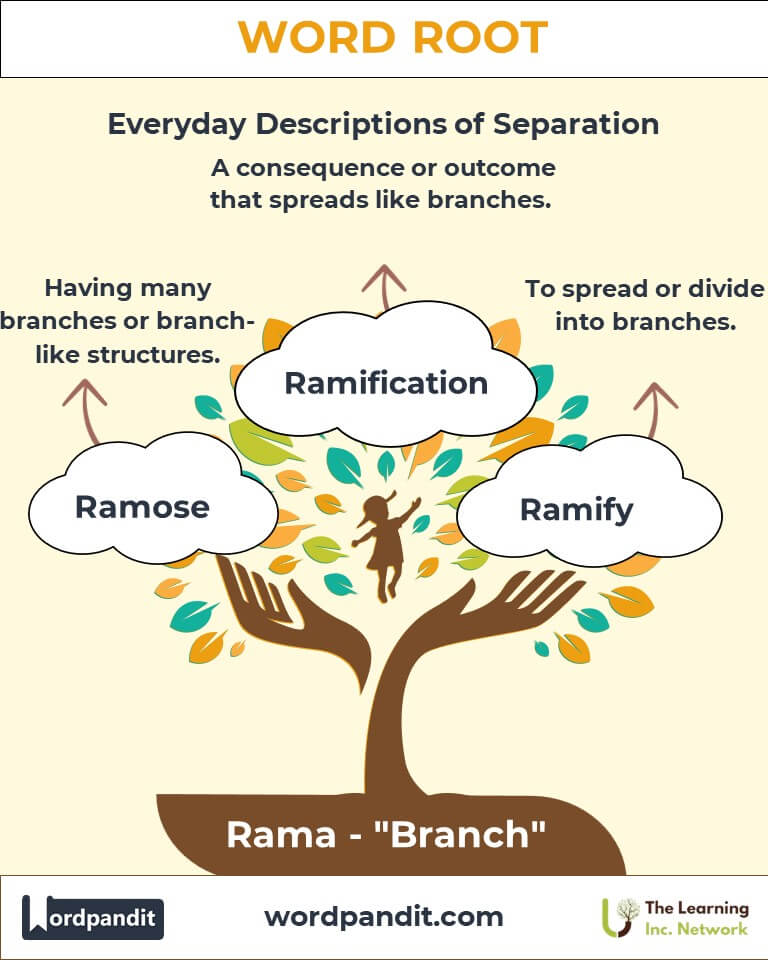 Picture a tree with sprawling branches, each one labeled with a word like "ramification" or "ramose." This imagery captures the branching nature of the root "rama."