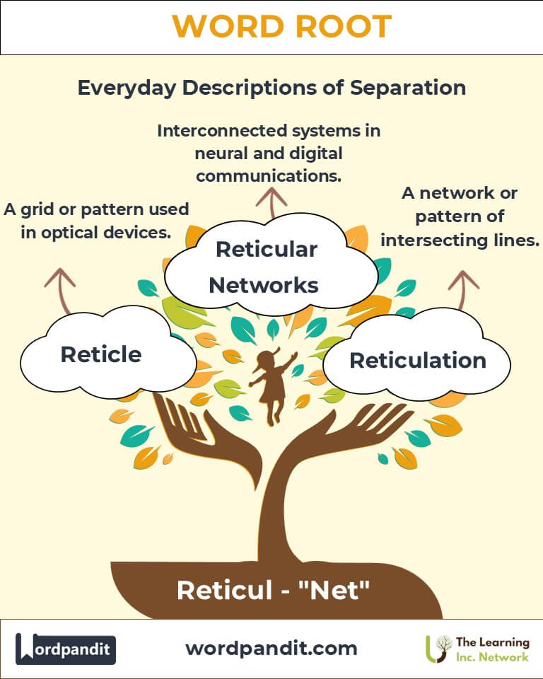 To remember "reticul," envision a fisherman casting a net (reticulum) into the water, pulling it back filled with fish. The net symbolizes interconnectedness, perfectly capturing the essence of the root.