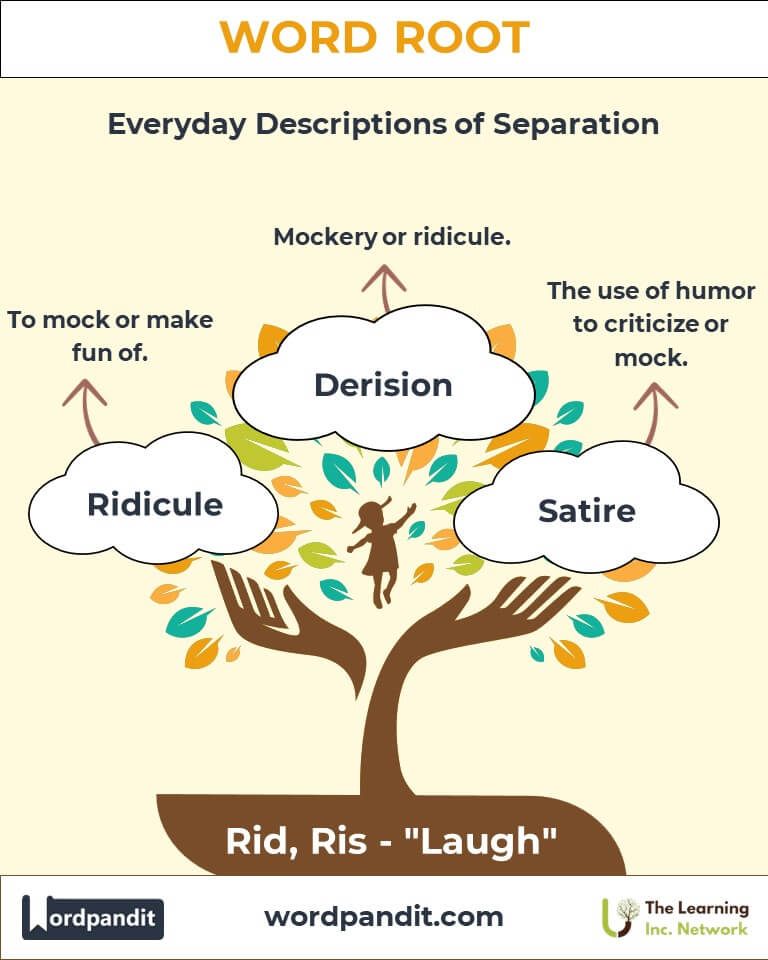 The roots "rid" and "ris" are foundational to the language of humor and critique. They remind us that laughter, whether joyous or critical, plays a vital role in human interaction. As language evolves, these roots continue to inspire creativity and expression, celebrating the universality of laughter in connecting and uplifting us all.