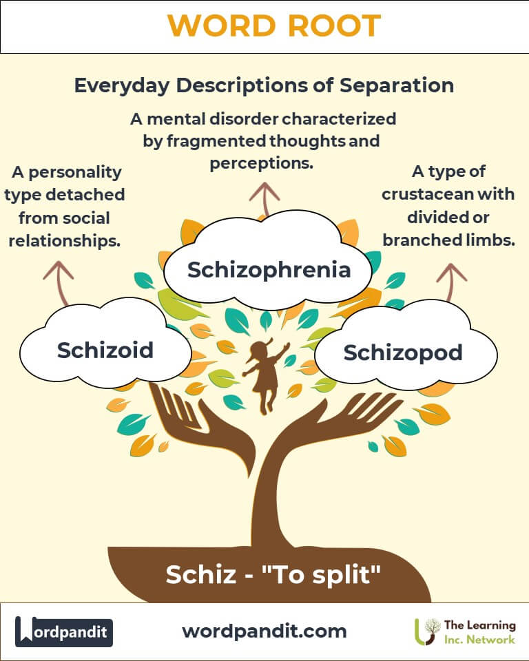 The root schiz, pronounced skits, evokes images of division and separation. From schizophrenia, describing a split in perception or thought, to schism, indicating a division in groups or ideologies, this root emphasizes the idea of "split" across contexts. Its relevance spans mental health, philosophy, and societal dynamics, embodying the profound impact of fragmentation.