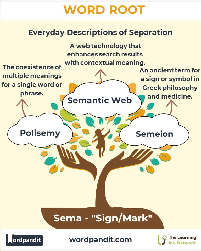 The root sema means "sign" or "mark." It originates from Greek and appears in terms related to meaning, communication, and symbolism. - What are semantics?