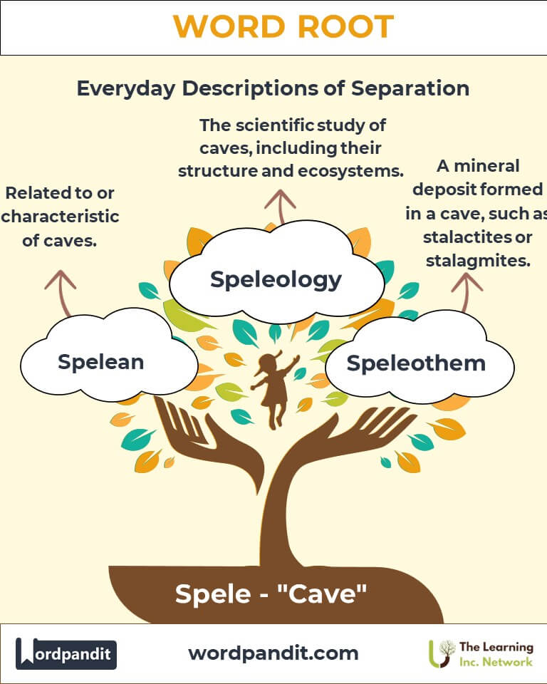The root "spele" invites us to explore the captivating world beneath our feet. From the scientific endeavors of speleology to the adventurous spirit of spelunking, it captures the mysteries and marvels of caves. Whether through studying their formations or navigating their depths, "spele" reminds us of the richness hidden within the Earth and the importance of preserving these subterranean treasures. Let "spele" inspire your curiosity to delve deeper into the unknown.