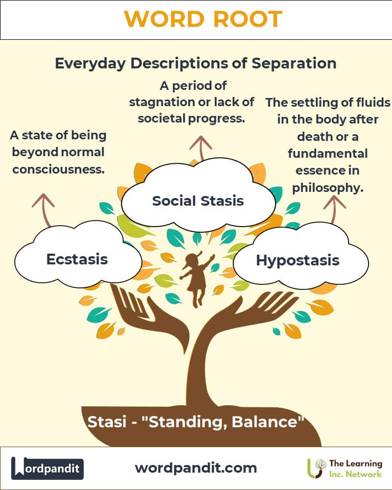 The root "Stasi" highlights the universal importance of balance, whether in the human body, societal structures, or dramatic narratives. By exploring this root, we deepen our understanding of equilibrium and stability, key to navigating the complexities of life. Let "Stasi" inspire you to find balance in your pursuits and appreciate the moments of stillness amidst change.
