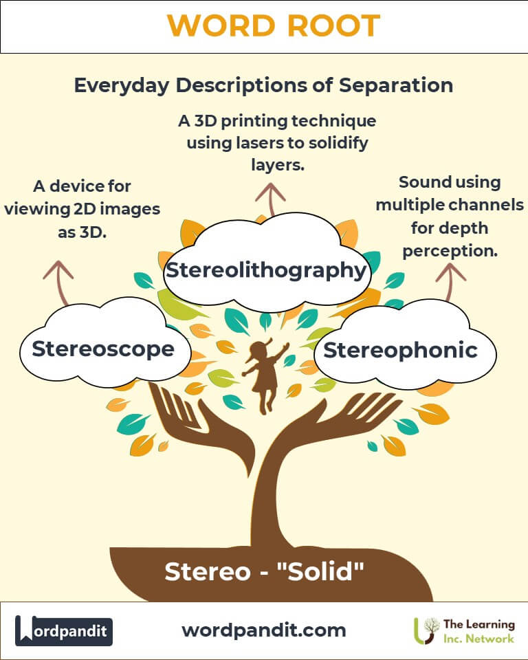 The root "Stereo" traces its origins to Ancient Greek, where stereos denoted solidity or a firm structure. In the Renaissance, as optics and physics developed, the term gained prominence in describing three-dimensional space. By the 19th century, the stereoscope—a device for viewing 3D images—popularized the root further. The 20th century witnessed its evolution into audio technologies like stereophonic sound, highlighting its adaptability.