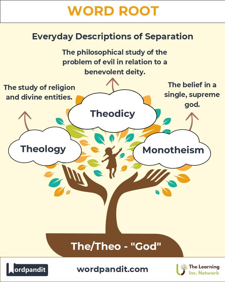 The roots "The" and "Theo" originate from the ancient Greek theos, meaning "god." In early Greek civilization, theos was central to religious, philosophical, and political contexts. During the spread of Christianity, Latin translations carried the root into words like theologia, which later became theology in English. Similarly, the Enlightenment's focus on reason and science popularized terms like atheist, emphasizing disbelief in deities.