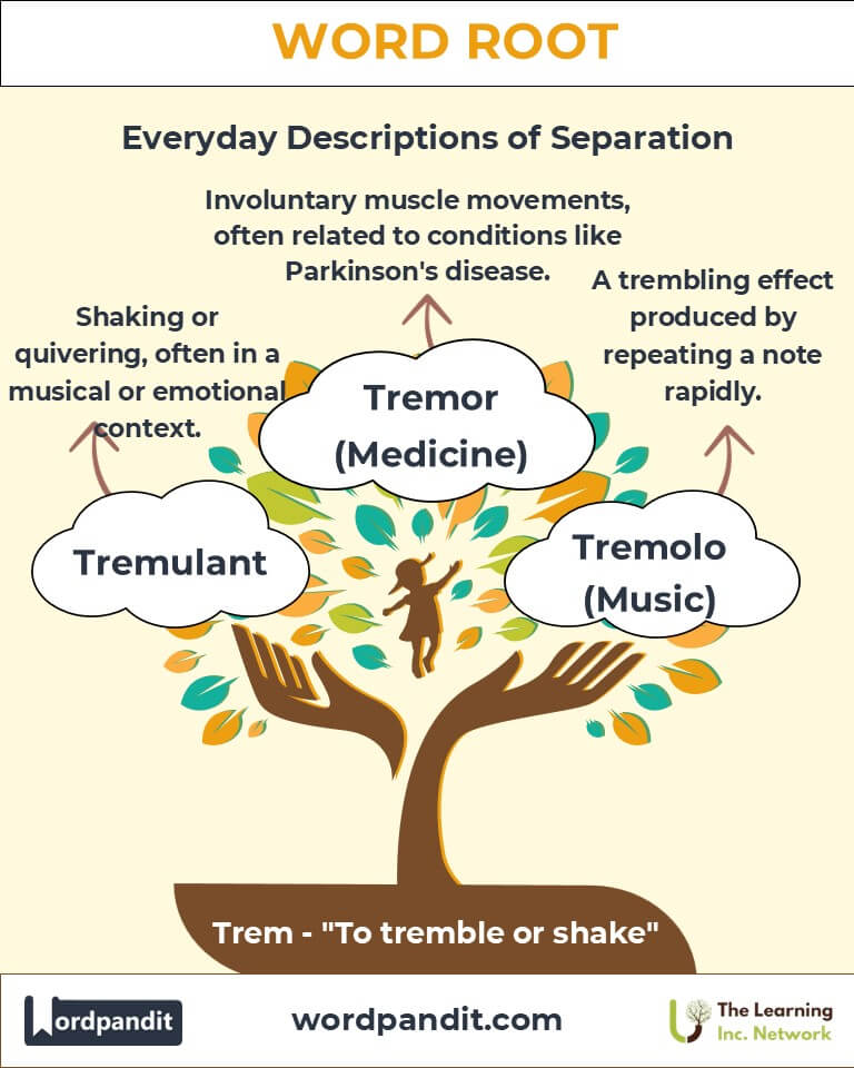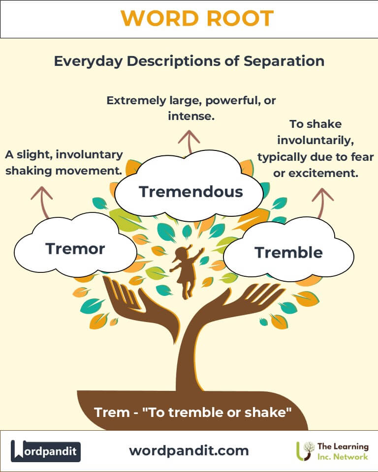 Discover the essence of the word root "trem," meaning "to tremble" or "shake." Derived from Latin, this versatile root finds its way into words that describe movement, emotions, and intensity. From the everyday term "tremor" to the impactful "tremendous," the "trem" root illustrates the dynamic energy of shaking, whether literal or metaphorical.