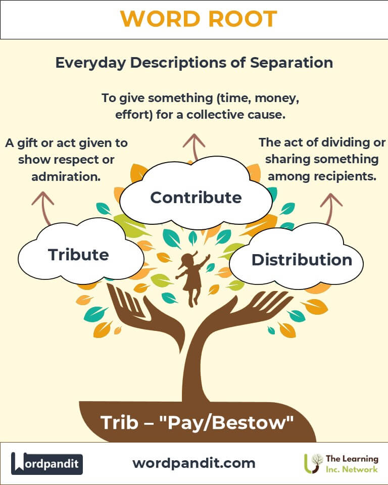 The root "Trib" symbolizes humanity’s enduring commitment to giving, sharing, and honoring. Its presence in words like "tribute" and "contribute" reflects the timeless importance of acts that build and strengthen communities. By understanding "Trib," we connect with a linguistic tradition that emphasizes gratitude, fairness, and collective growth.