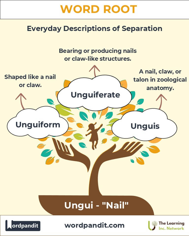 The root "ungui" traces its origin to the Latin word unguis, meaning nail, claw, or talon. Ancient Romans used it to describe not only human nails but also the claws of animals and hooked botanical structures. Over time, "ungui" expanded into scientific terminologies, retaining its visual and functional connotations.