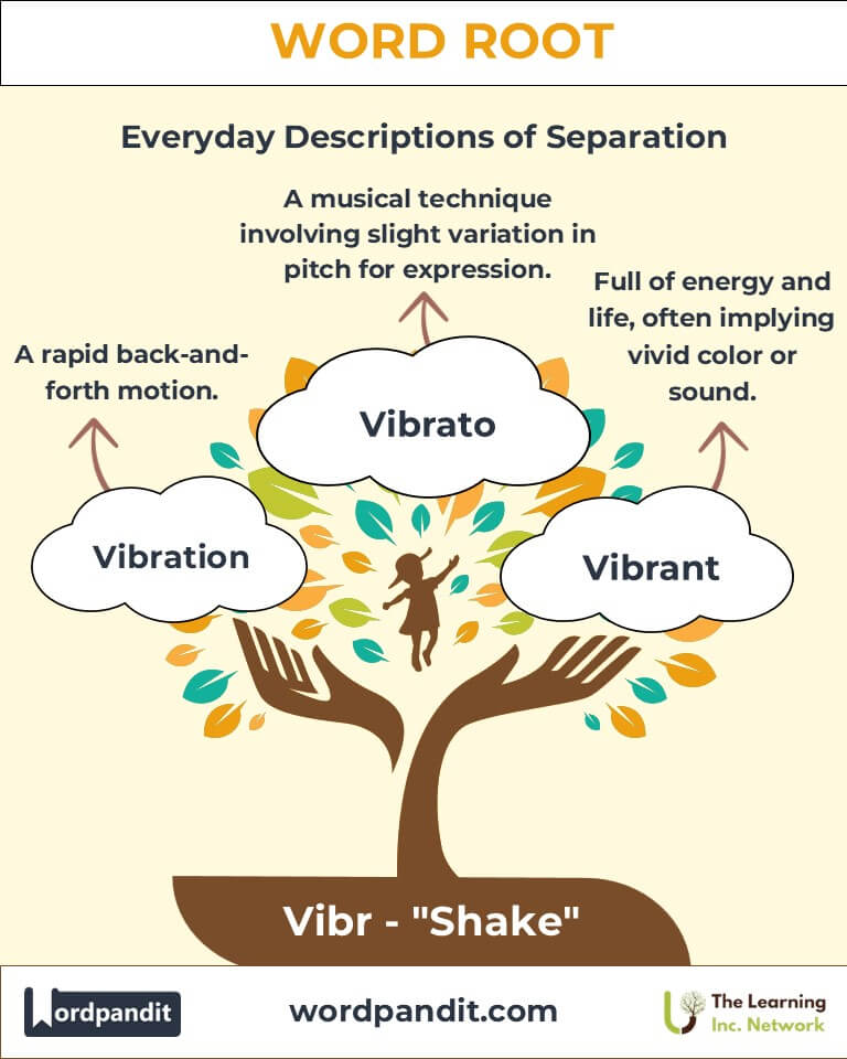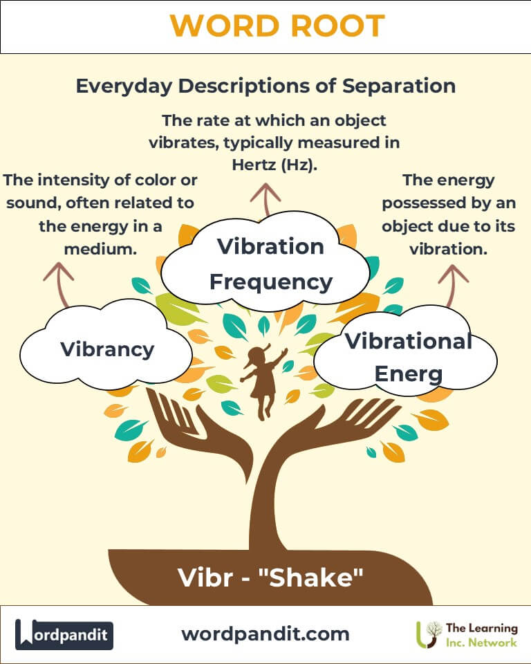 What makes sound waves travel or a phone alert you with a buzz? It's all thanks to the root "vibr", meaning "shake." Derived from the Latin vibrare, this root infuses words with a sense of energy and motion. Pronounced as "vy-br," it resonates in everyday language and specialized terminologies alike, reflecting movement and rhythm in various domains.
