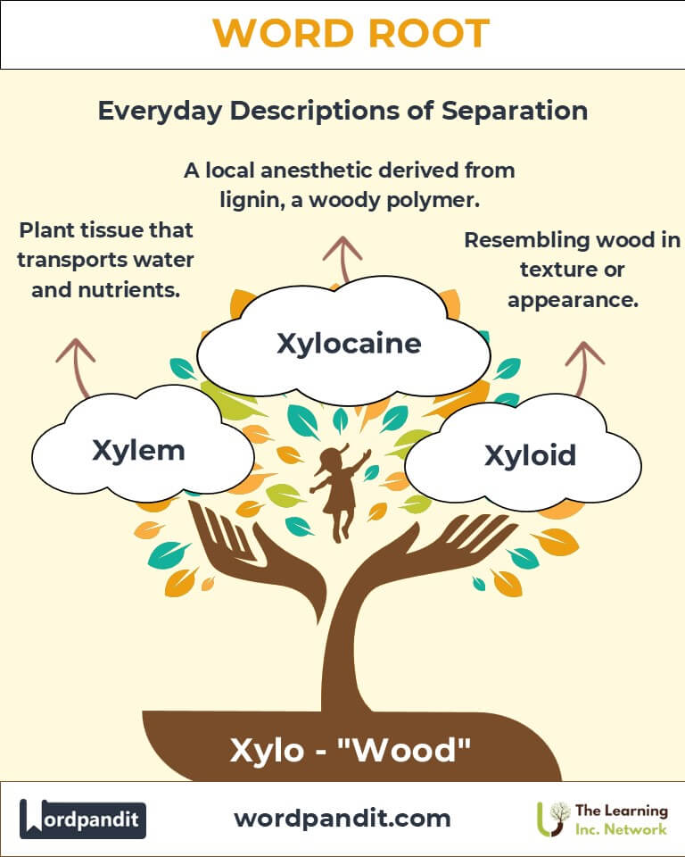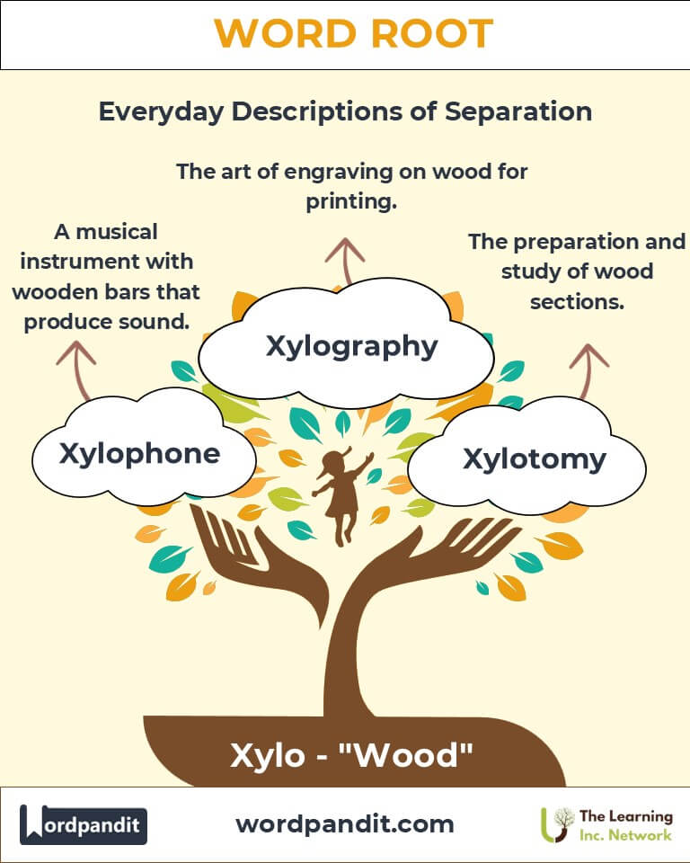 To remember "Xylo," picture a vibrant xylophone, its wooden bars glowing as they produce a cheerful tune. This image connects the root to the essence of wood and its transformative power.