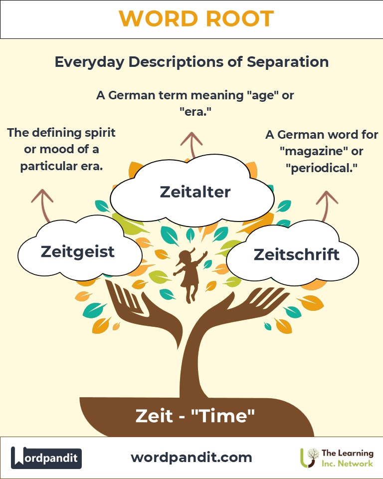 A: The root "zeit" comes from the German word for "time." It is used in words and phrases that emphasize the passage of time, historical periods, or moments of significance.