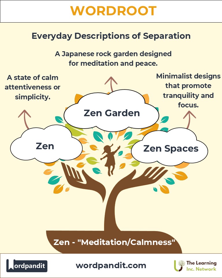 To remember "Zen," visualize a serene monk meditating under a blossoming tree. The calm surroundings symbolize inner peace and focus.