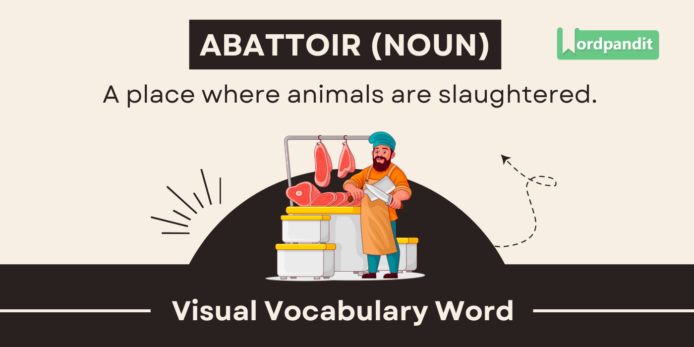 To remember “abattoir,” think of “a battle” that ends with “to war”—capturing the harsh nature of its purpose. Alternatively, imagine the word “abate” (to lessen) combined with “toir,” recalling a place where life “abates” or comes to an end for animals. Visualizing an industrial building where livestock are brought for processing might help reinforce this term’s meaning.