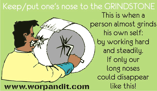 Keep / put one’s nose to the grindstone: This idiom means to to work, study, or practice hard and steadily or to cause someone to do so: If I put my nose to the grindstone, I’ll finish the job as soon as a week.